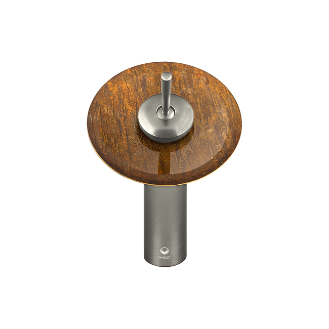 The VIGO Single Lever Waterfall Faucet in Brushed Nickel features an Amber Sunset glass disc