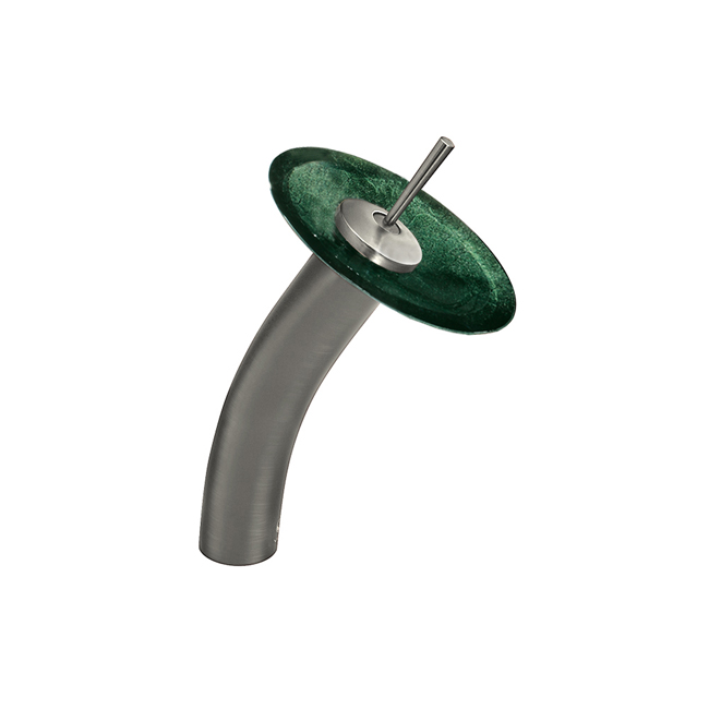 The VIGO Single Lever Waterfall Faucet in Brushed Nickel features an Emerald glass disc