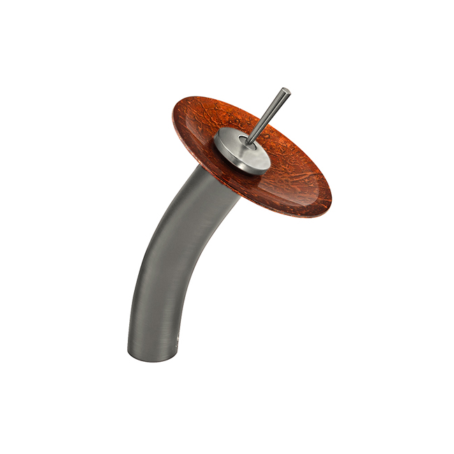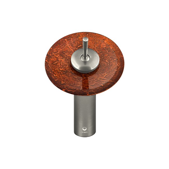 The VIGO Single Lever Waterfall Faucet in Brushed Nickel features a Mahogany Moon glass disc