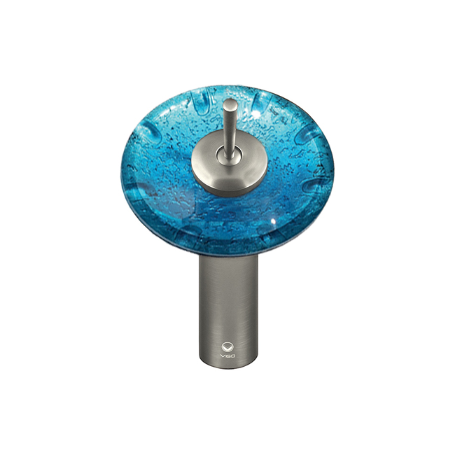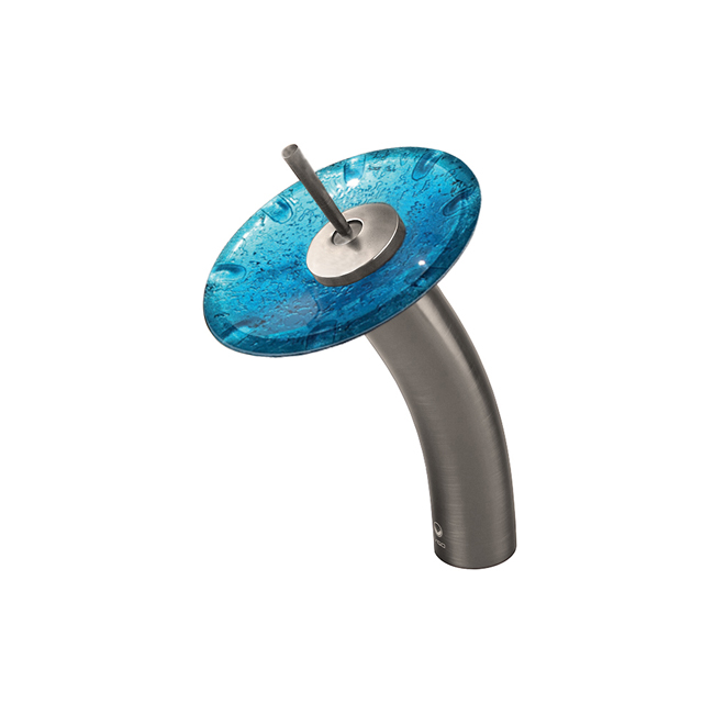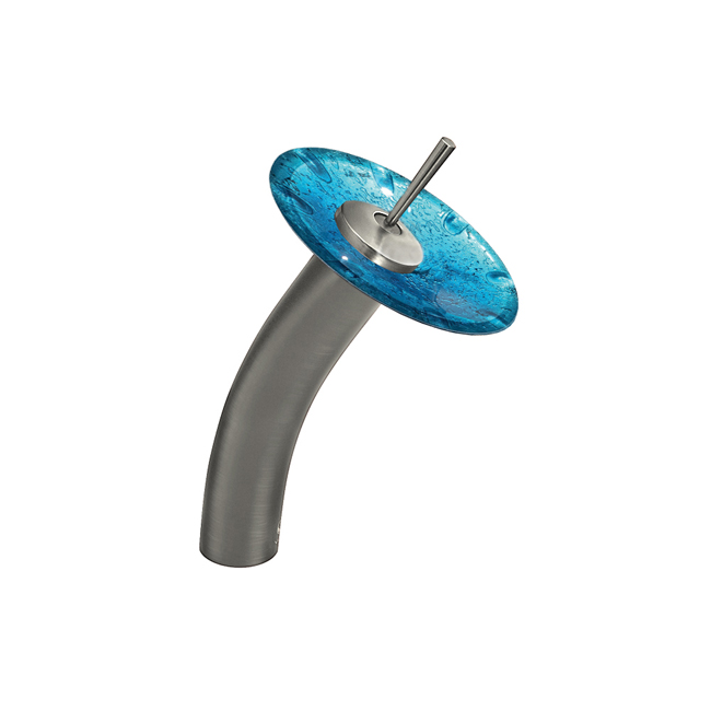 The VIGO Single Lever Waterfall Faucet in Brushed Nickel features a Mediterranean Seashell glass disc