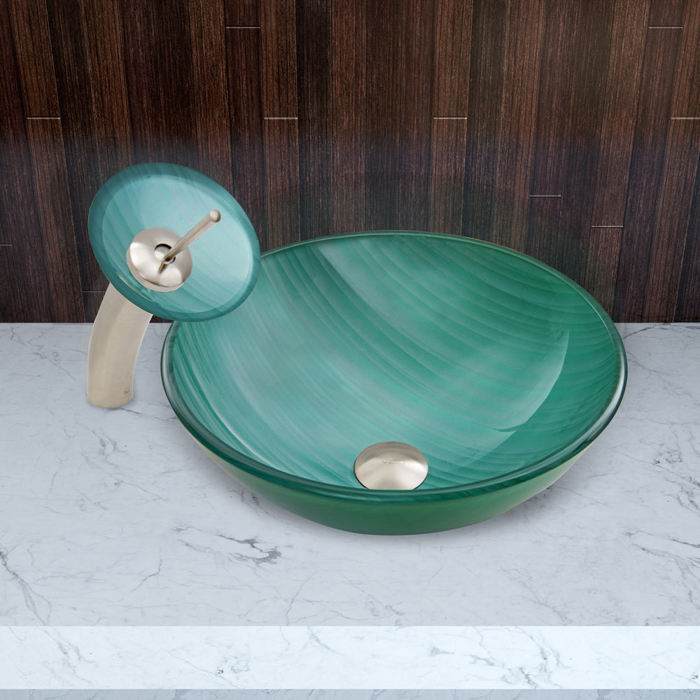 The VIGO Whispering Wind is a breath of fresh air in your new bathroom. The greenish blue hue and whisps of white will be a lovely addition to your bathroom.