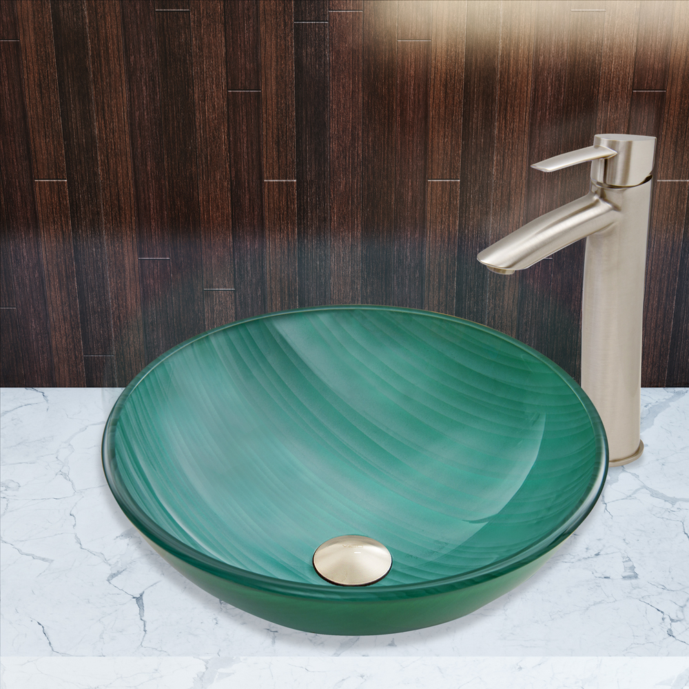 The VG07066 Whispering Wind glass vessel bowl features a greenish-blue hue and whips of white, bringing a breath of fresh air to your bathroom.
