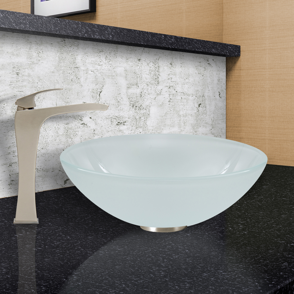 The VG07043 White Frosted Glass vessel bowl features a translucent, soft white color, creating a refreshing appearance.
