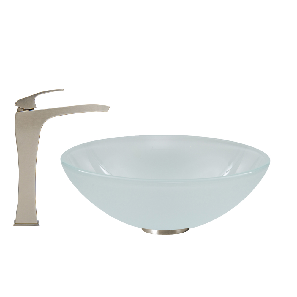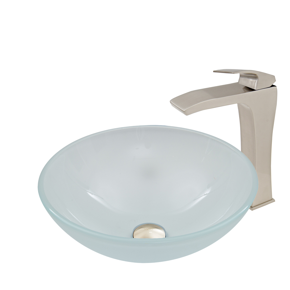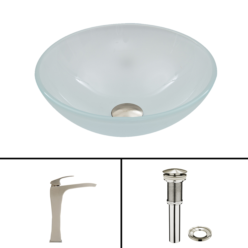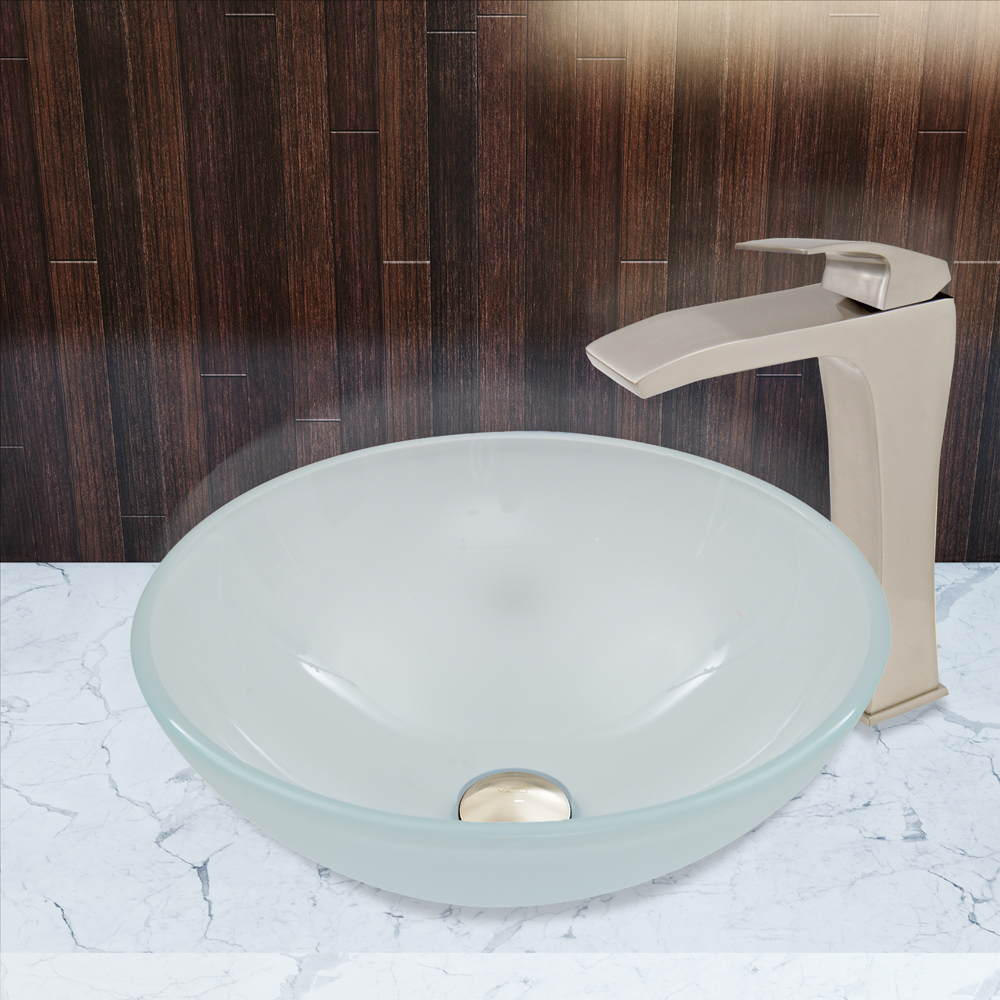 The VIGO White Frosted Glass Vessel Sink and Blackstonian Faucet Set in Brushed Nickel Finish adds a sophisticated touch of elegance to your bathroom.