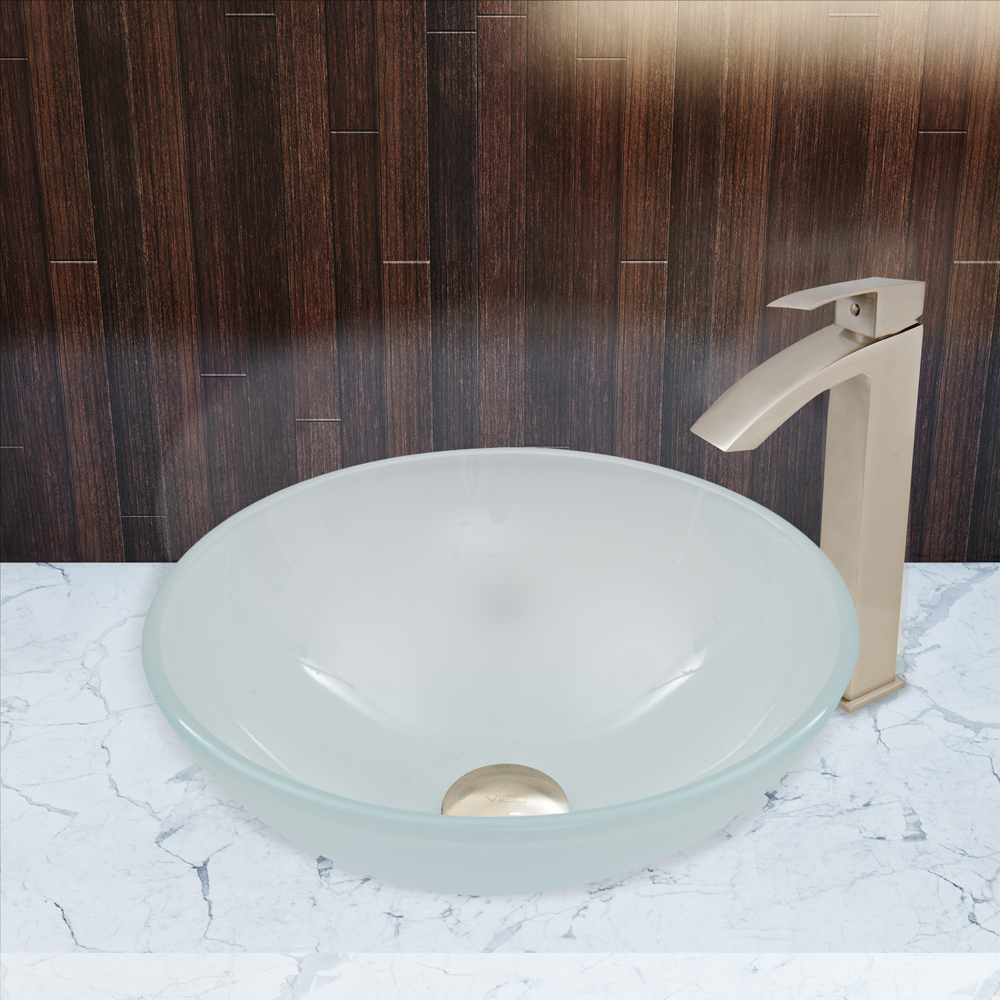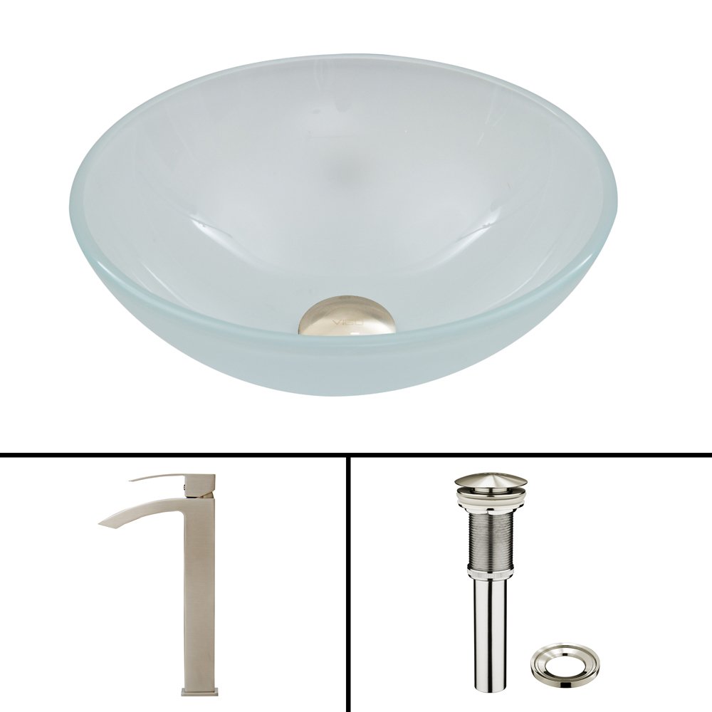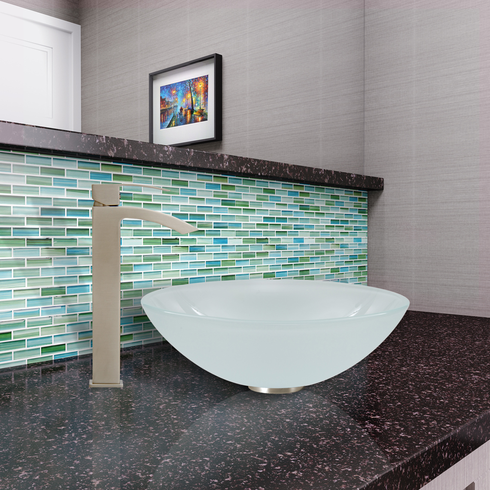 The VIGO White Frosted Glass Vessel Sink and Duris Faucet Set in Brushed Nickel Finish will transform your bathroom into a refreshingly stylish space.