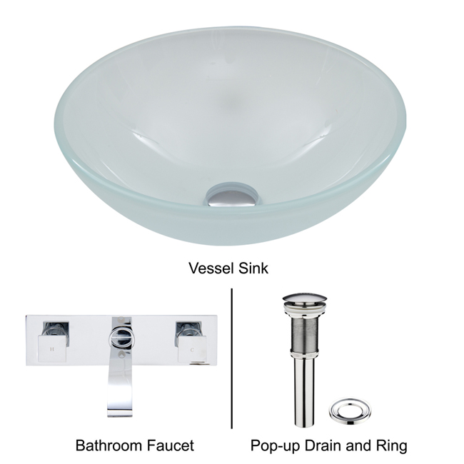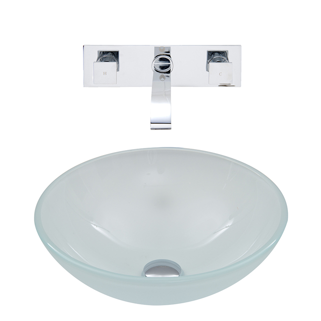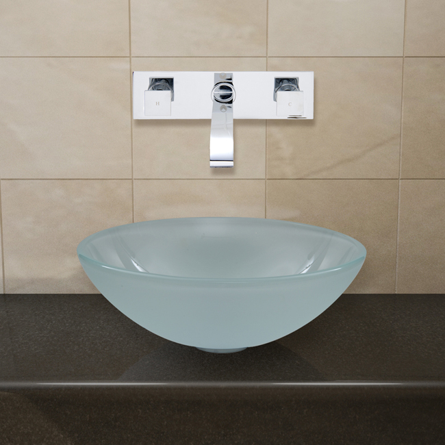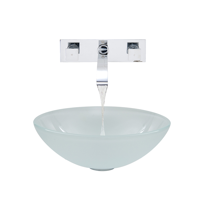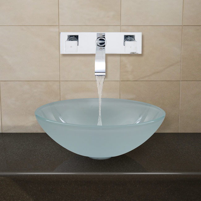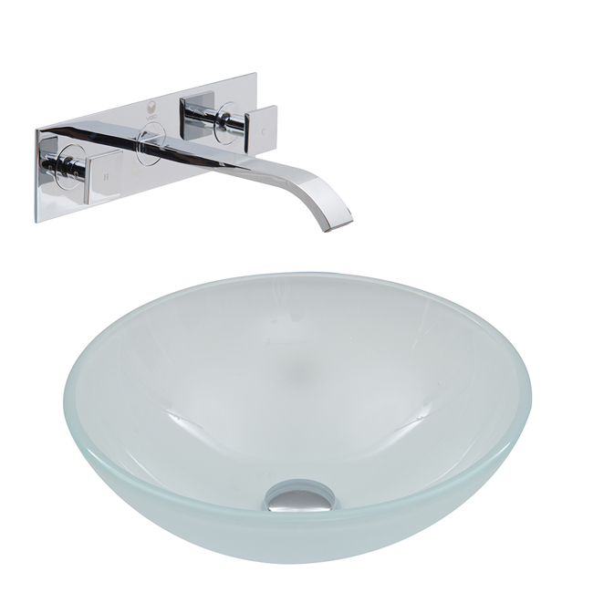 The VIGO White Frost glass vessel sink with Chrome wall mount faucet set will bring a simply modern flair to your bathroom.