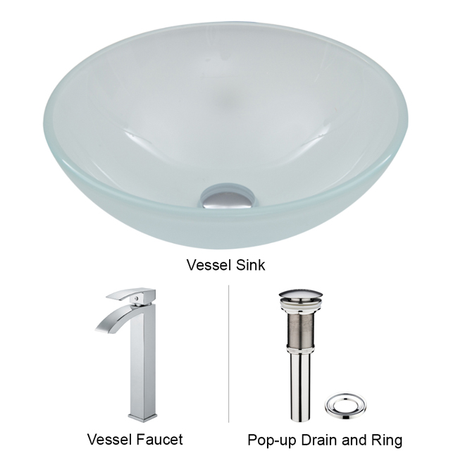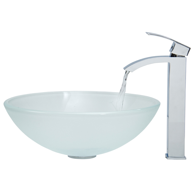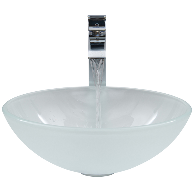 The VIGO White Frost glass vessel sink with Chrome faucet set is modern and stylish.