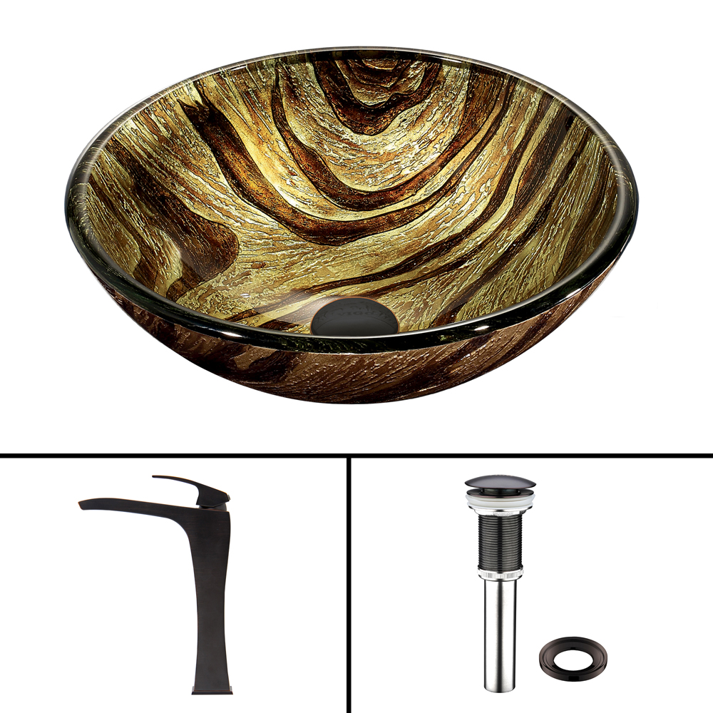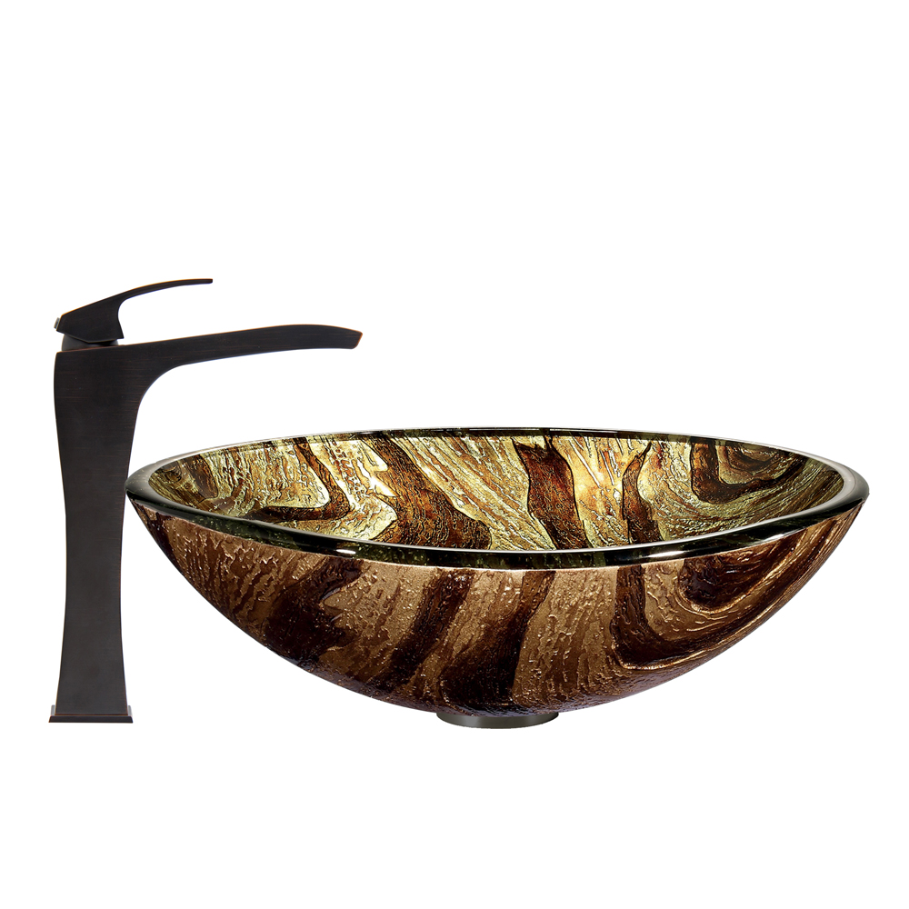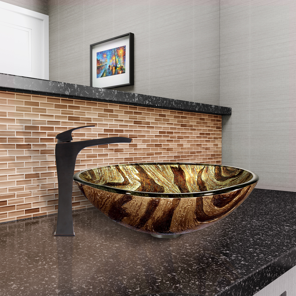 The VIGO Zebra Glass Vessel Sink and Blackstonian Faucet Set in Antique Rubbed Bronze Finish will make your new bathroom the most stylish room in your house.