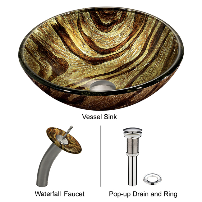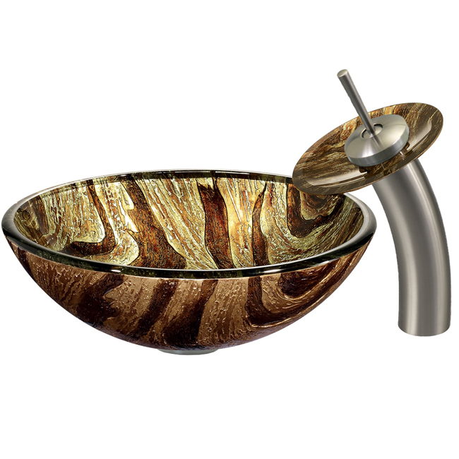 The VG03002BN028 waterfall faucet features a Brushed Nickel finish with matching Zebra glass disc