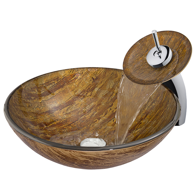 The VIGO Amber Sunset glass vessel sink and matching waterfall faucet set will