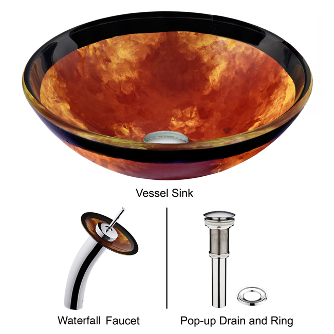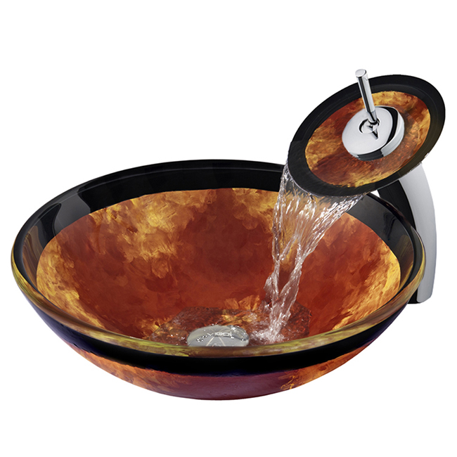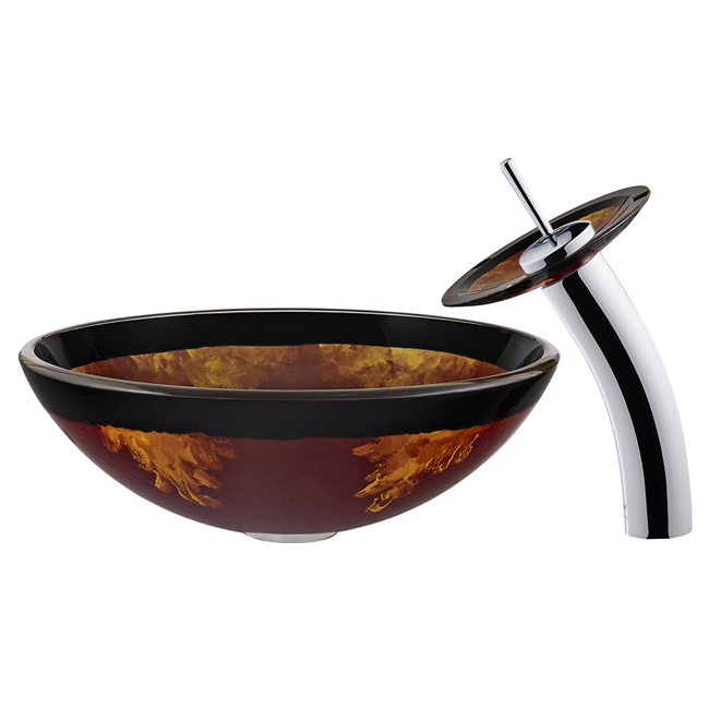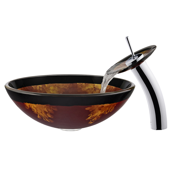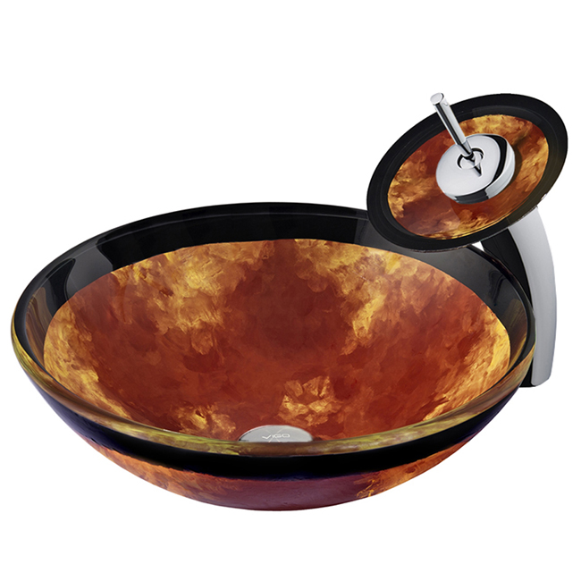 The VIGO Auburn/Mocha Fusion glass vessel sink and waterfall faucet set is sure to get your guests talking.