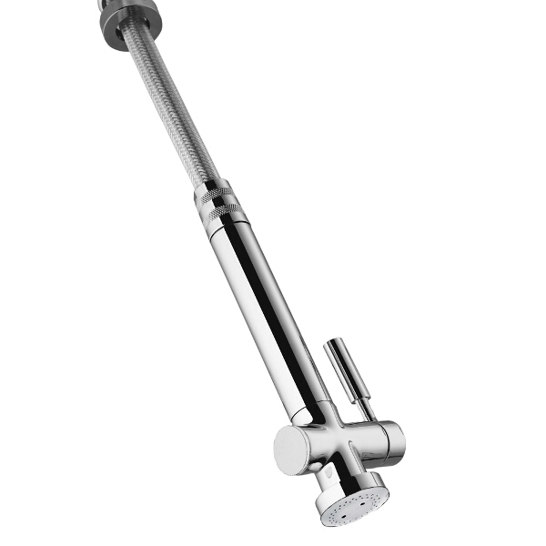 Faucet features a spiral pull-down spray head for powerful spray and separate spout for aerated flow