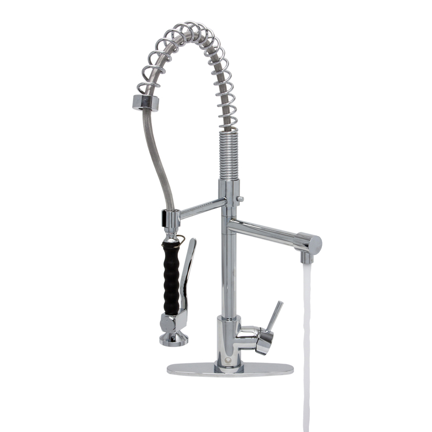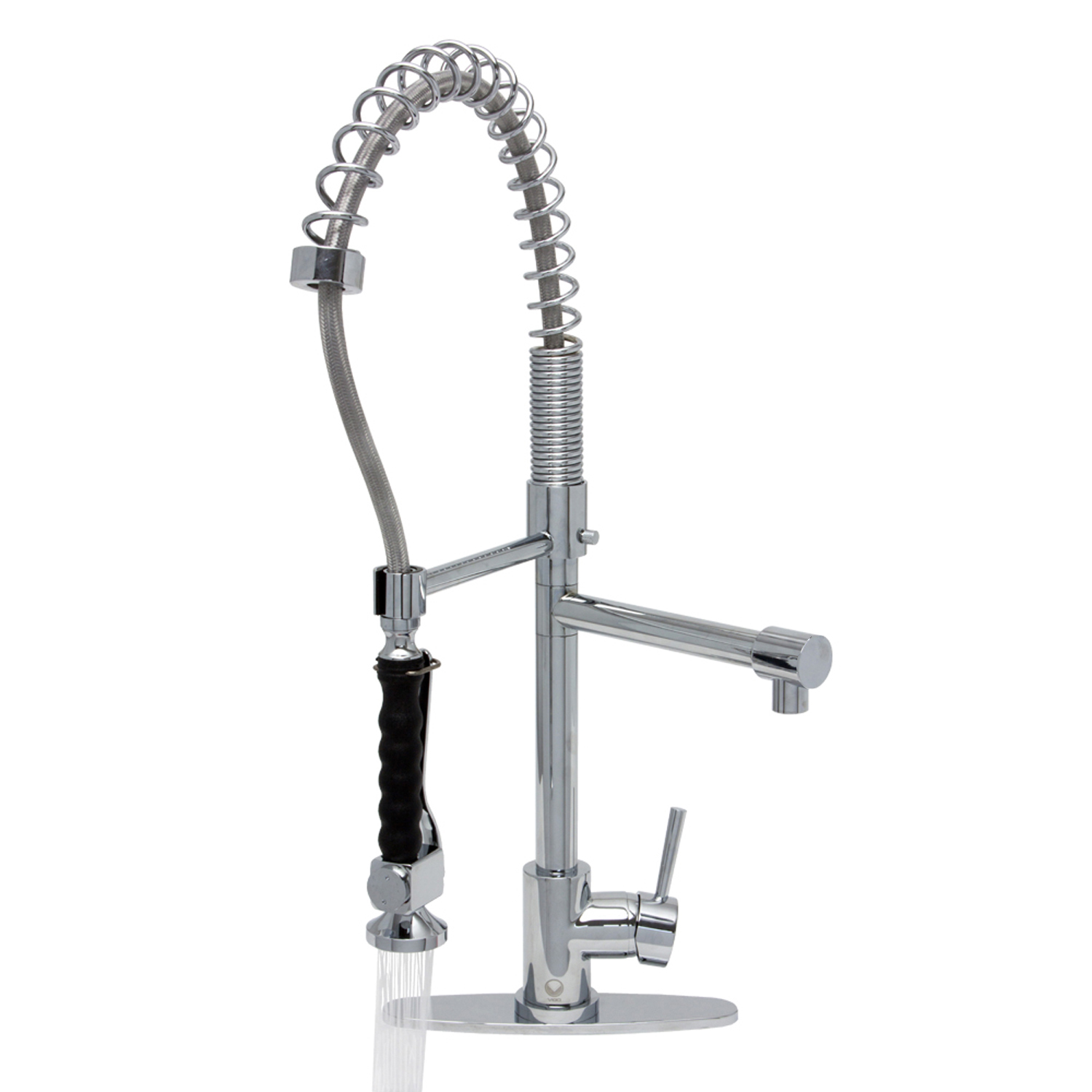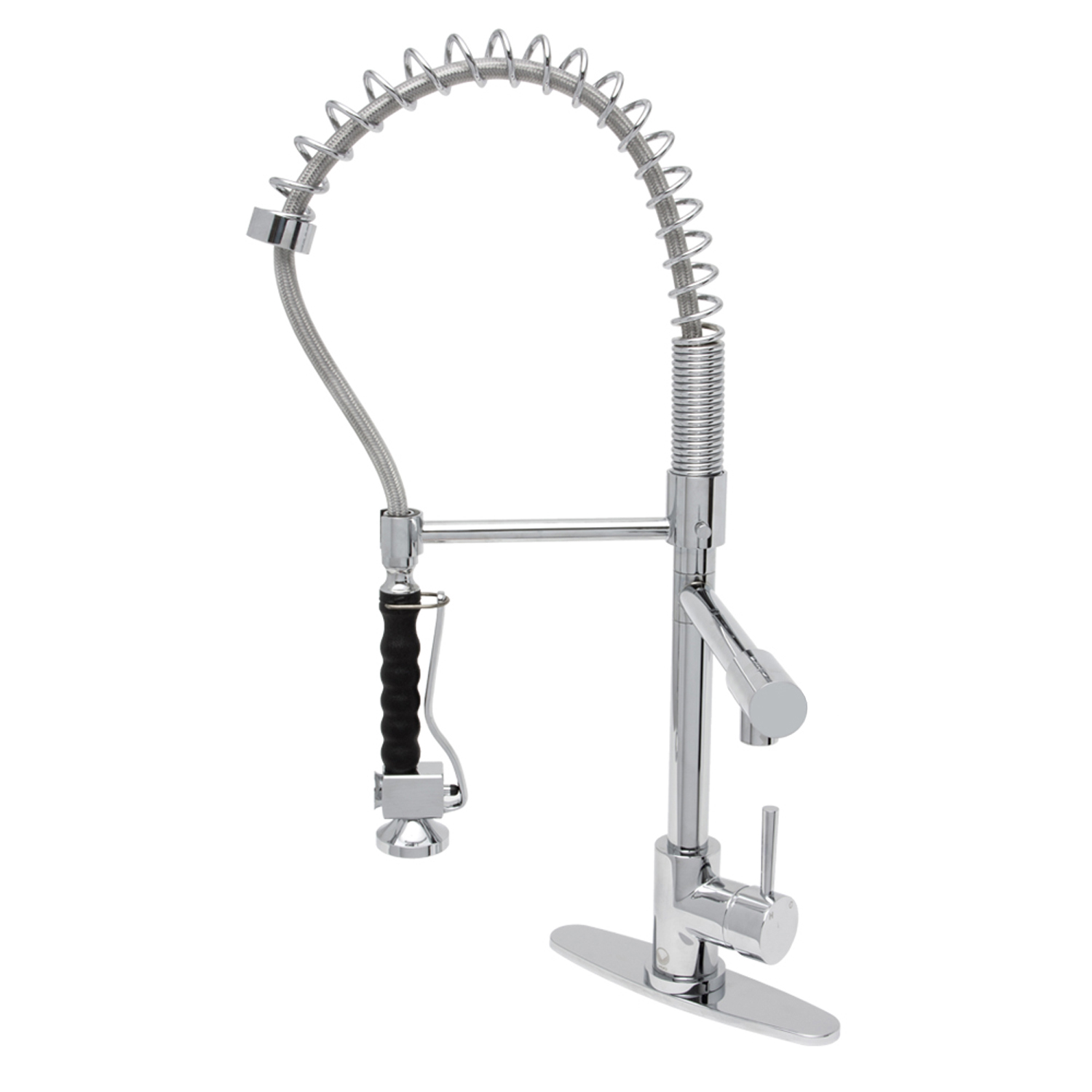 Faucet features a spiral pull-down spray head for powerful spray and separate spout for aerated flow