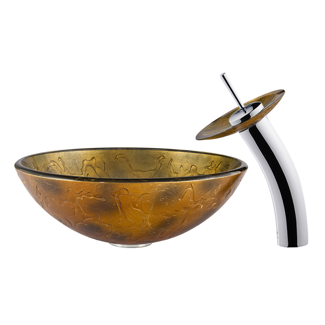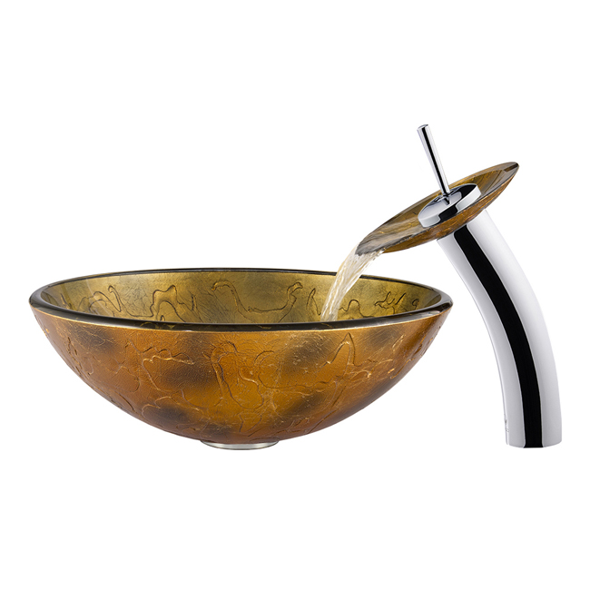 The VIGO Copper Shapes glass vessel sink and waterfall faucet set is bold and unassuming.