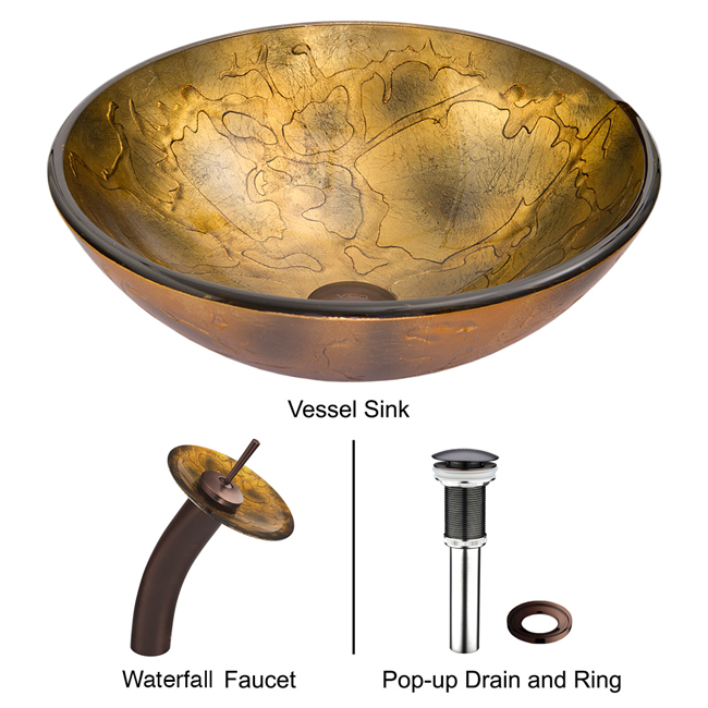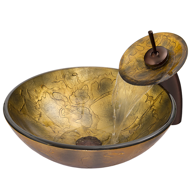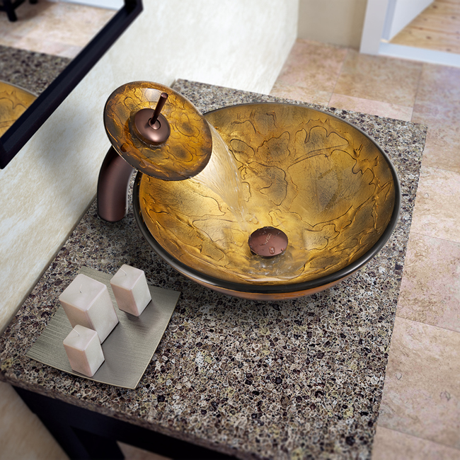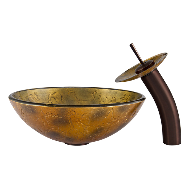 The VIGO Copper Shapes glass vessel sink and waterfall faucet set is bold and unassuming.