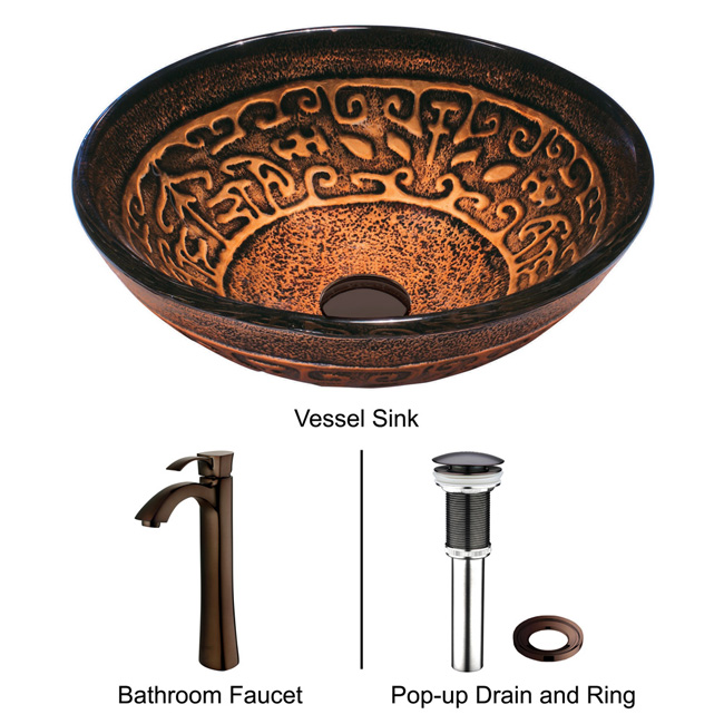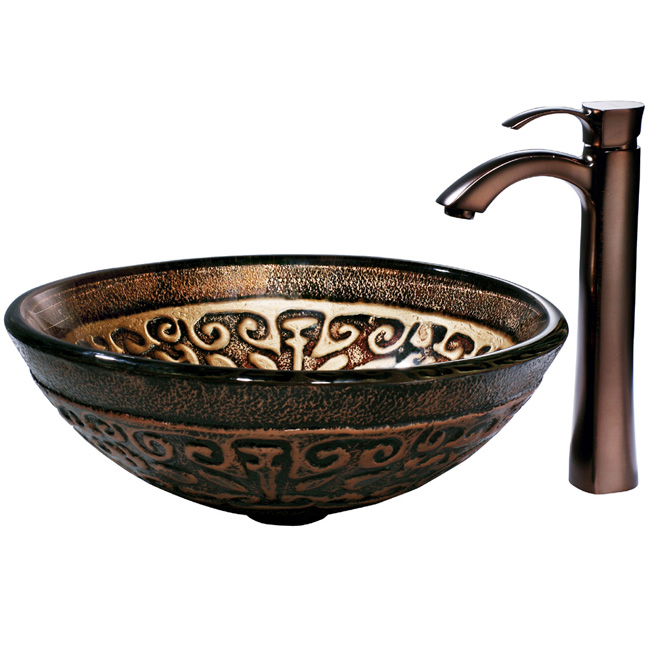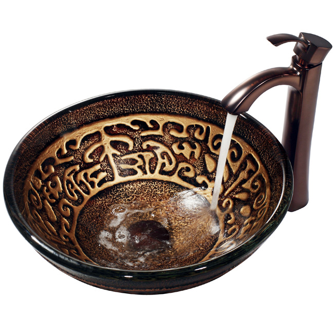 The VIGO Golden Greek glass vessel sink and faucet set will remind you of an antique art piece.