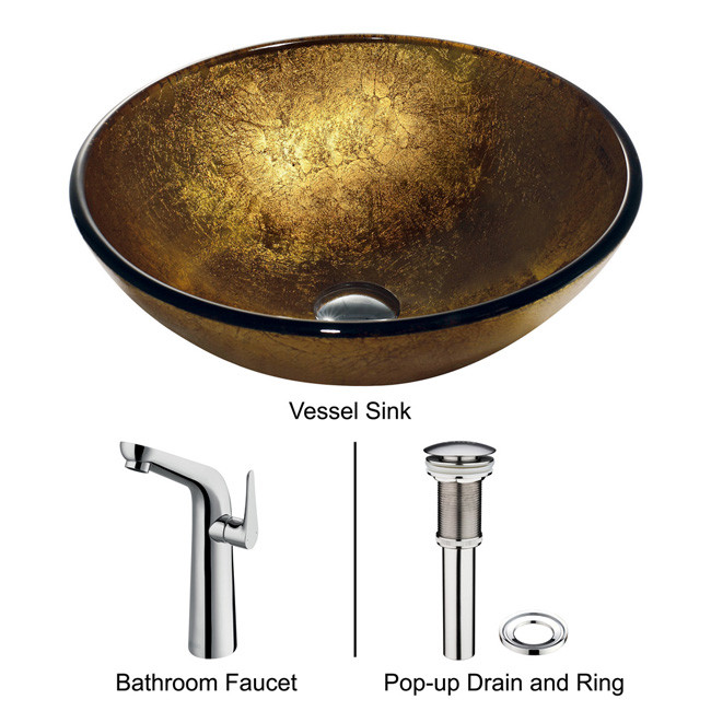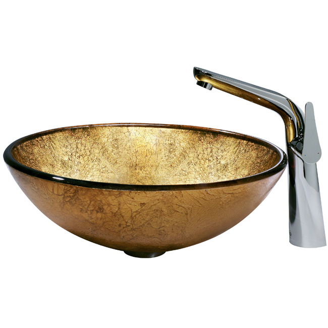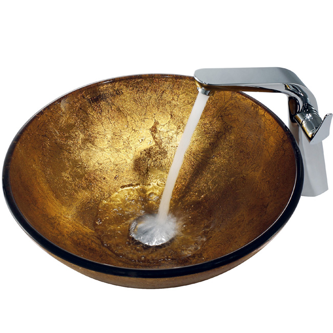 This VIGO Liquid Gold glass vessel sink and faucet set is as luxurious as it looks.