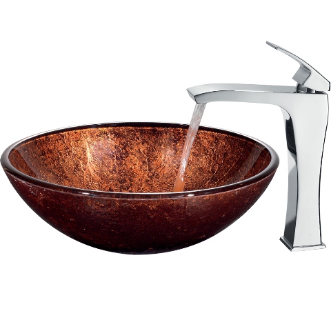 The VIGO Mahogany Moon glass vessel sink and faucet set is an