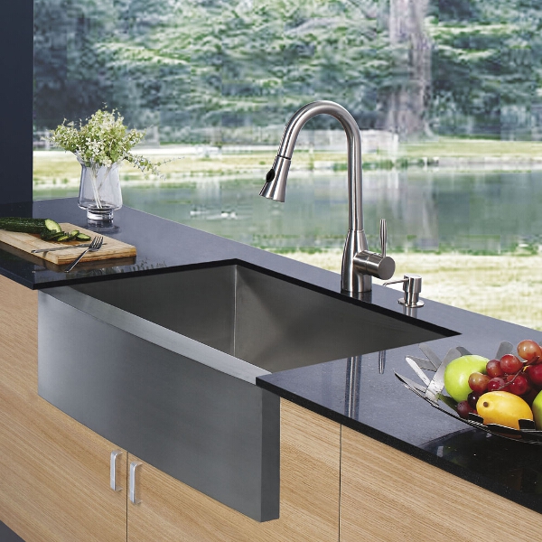 Enhance your kitchen workspace with a VIGO Farmhouse Stainless Steel Kitchen Sink, Faucet and Soap Dispenser.