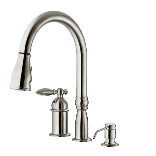 Faucet features a dual function pull-out spray head for aerated flow or powerful spray