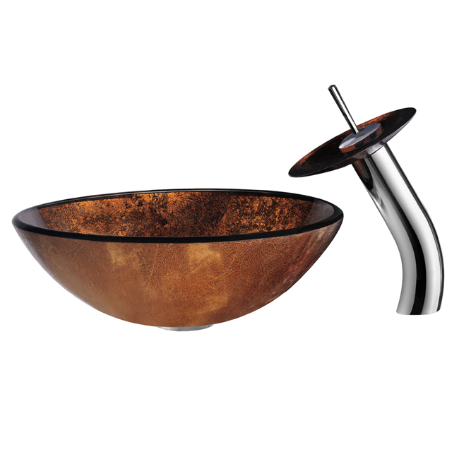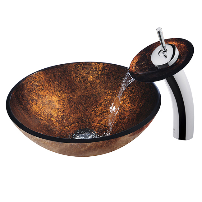The VIGO Russet glass vessel sink and waterfall faucet set brings
