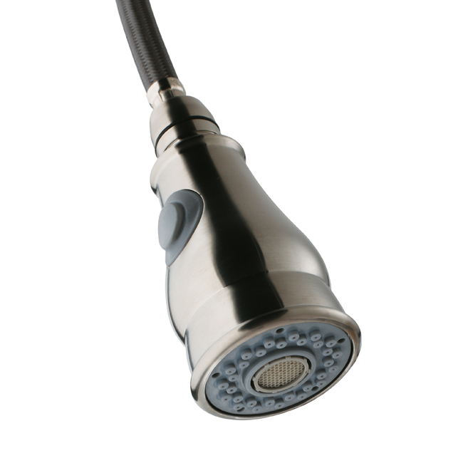 Faucet features a dual function pull-out spray head for aerated flow or powerful spray