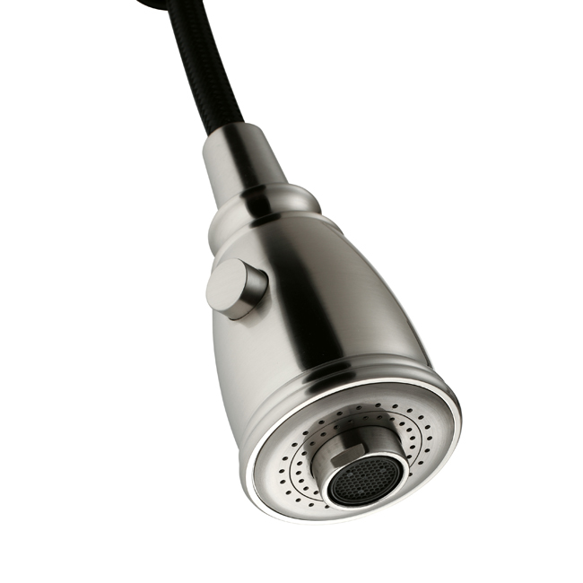 Faucet features a dual pull-out spray head for aerated flow or powerful spray
