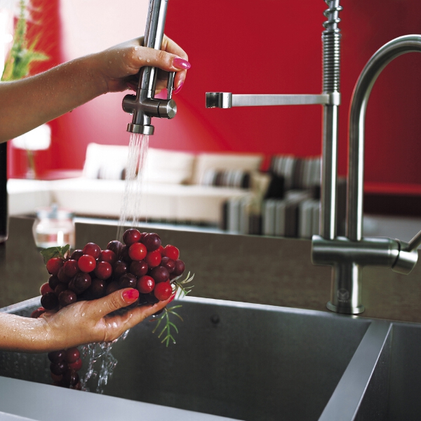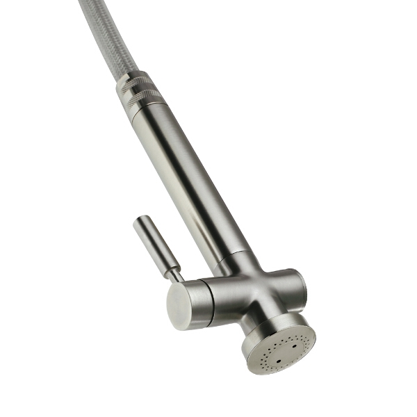 Faucet features a spiral pull-down spray head for powerful spray and separate spout for aerated flow