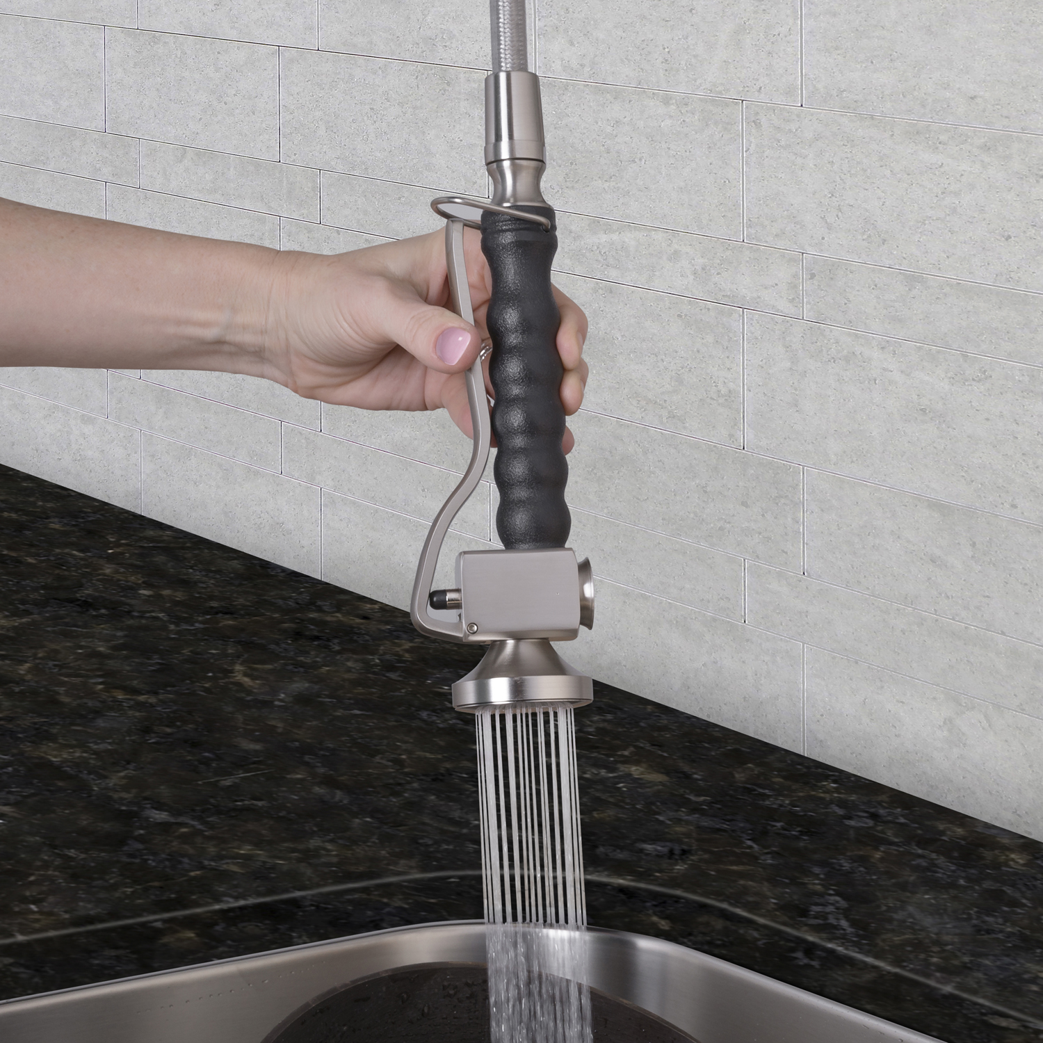 Faucet features a spiral pull-down spray head for powerful spray and separate spout for aerated flow