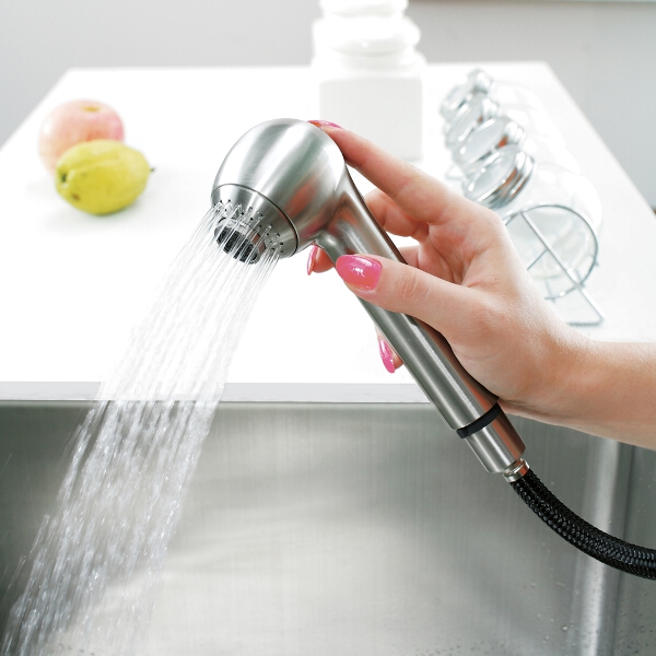 Faucet features a dual function pull-out spray head for aerated flow or powerful spray