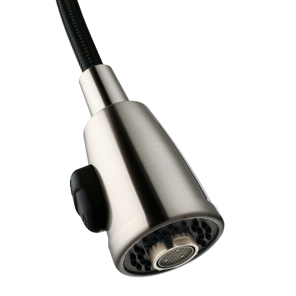 Faucet features a dual function pull-down spray head for aerated flow or powerful spray