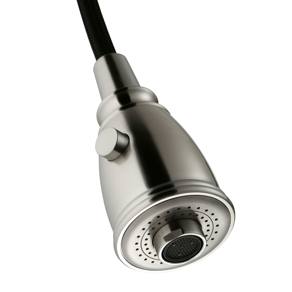 Faucet features a dual function pull-out spray head for aerated flow or powerful spray