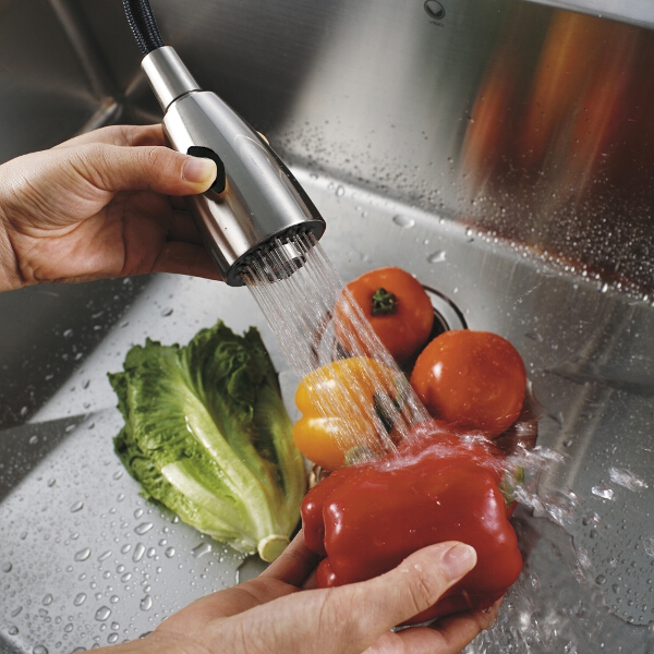 Faucet features a dual function pull-down spray head for aerated flow or powerful spray