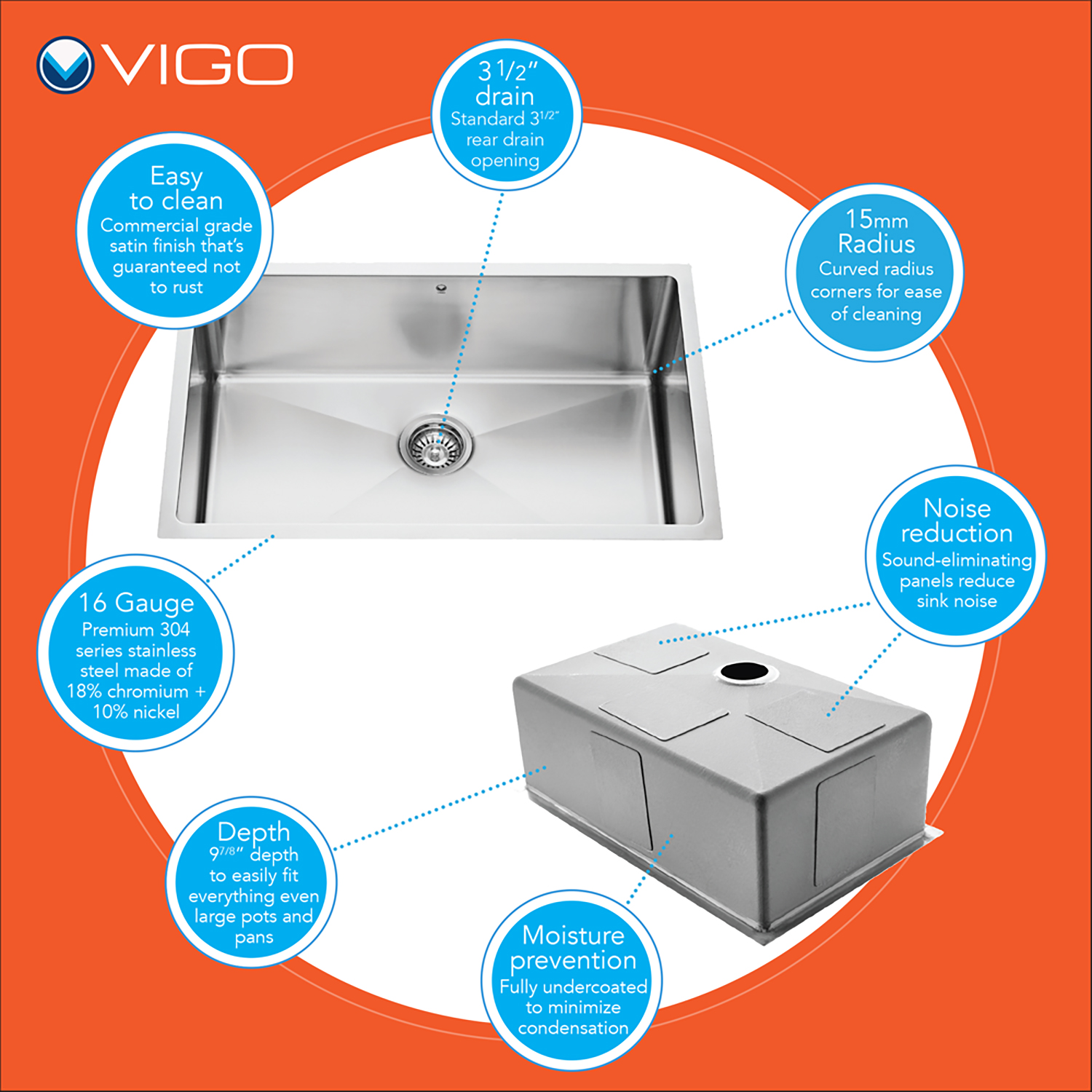 The VGR3019C Single-Basin Undermount Kitchen Sink is manufactured with 16-gauge premium 304 Series stainless steel construction