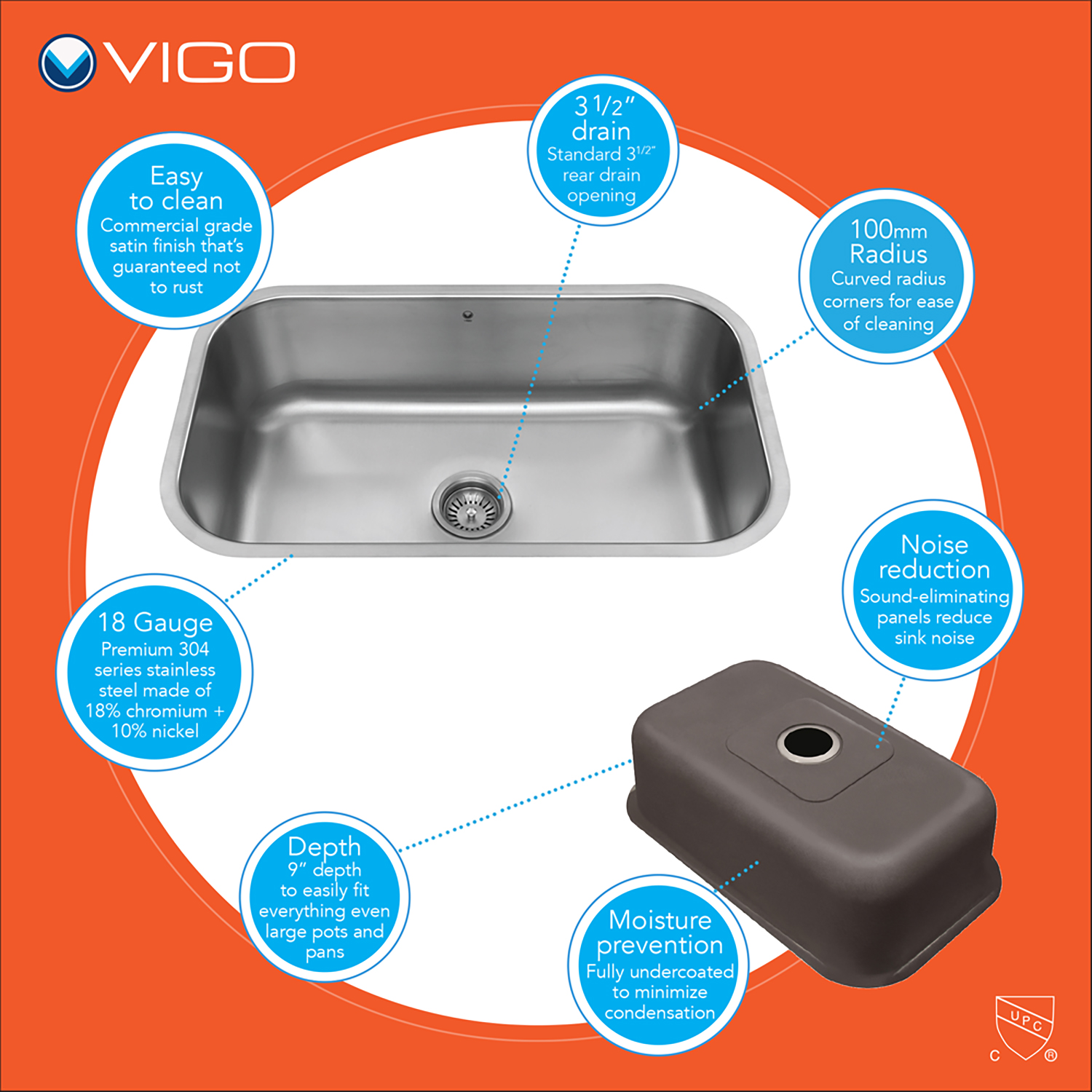 The VG3019C Single-Basin Undermount Kitchen Sink is manufactured with 18-gauge premium 304 Series stainless steel construction